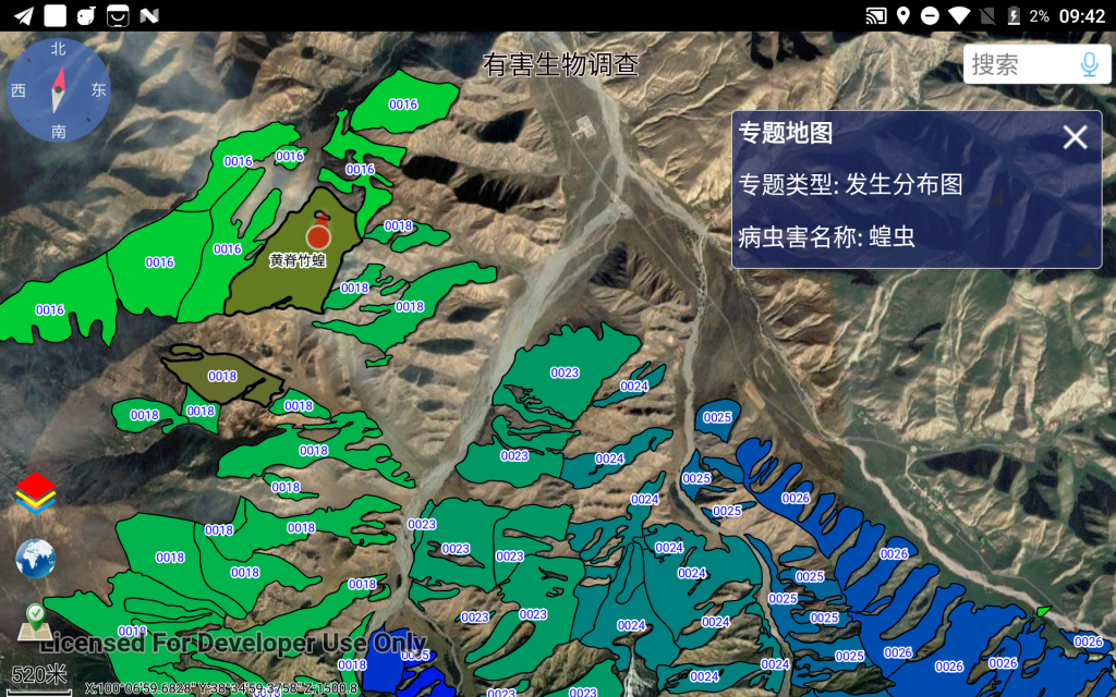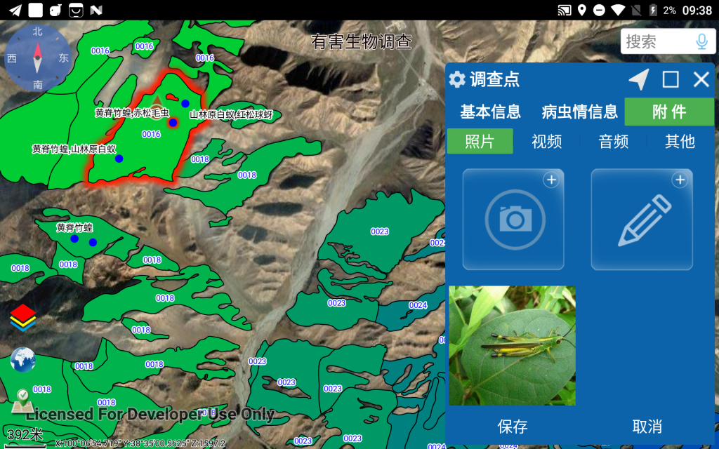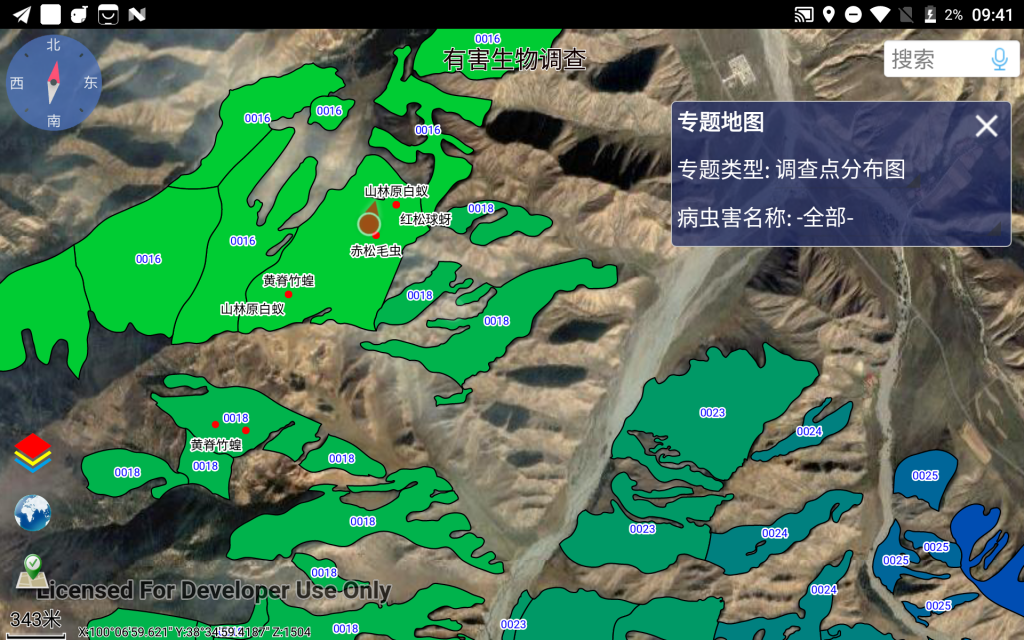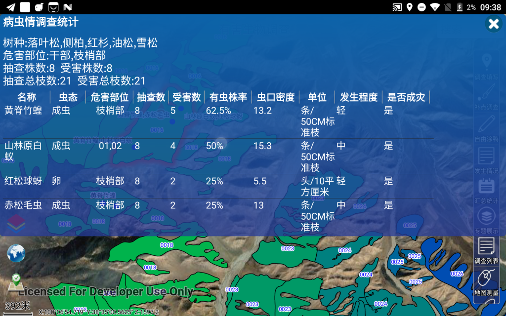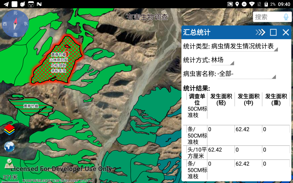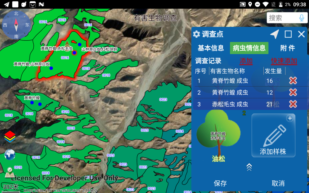 森防站工作人员根据地图中GPS定位及所在小班的指引,到达野外现场进行“有害生物发生点”的调查,采集并填写该调查点的详细息后(主要涉及样株、样枝的详细信息),在地图中形成已调查的若干个“有害生物发生点”。完成调查后,系统自动根据这些发生点确定受影响的林业小班,生成对应的病虫害发生情况记录(同时根据成灾标准配置自动计算出发生程度、是否成灾,并在地图上以不同颜色显示相关小班及病虫害名称),汇总生成各种需要的报表和有害生物发生分布图。最终导出发生情况和附件照片,方便上报至省防治管理系统。